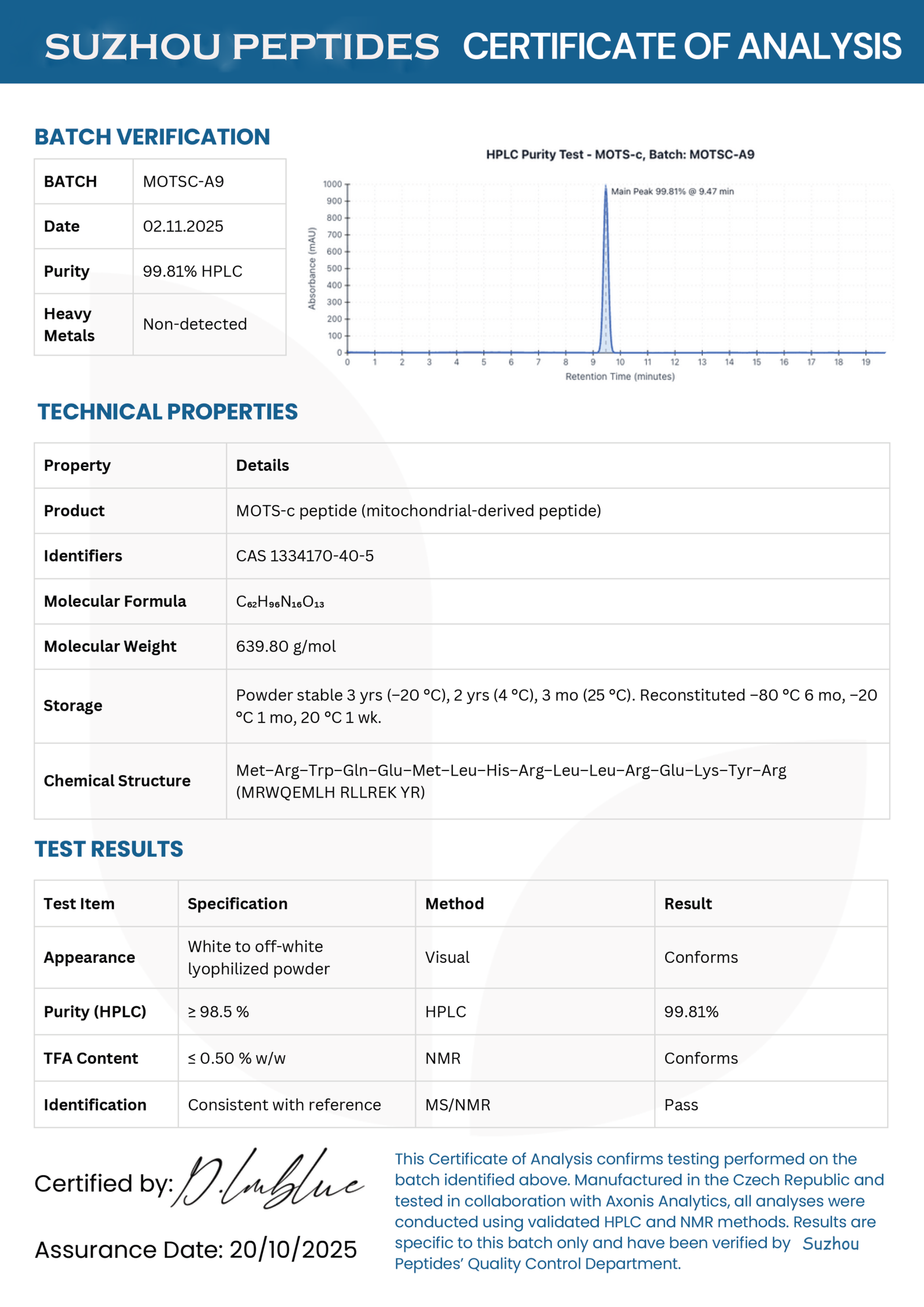 Product Specifications – MOTS-c 40mg